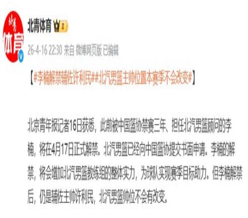 北京時(shí)間4月17日,中國籃壇迎來一則備受關(guān)注的消息:前中國男籃主帥李楠正式結(jié)束為期三年的禁賽期,恢復(fù)教練員注冊(cè)資格。與此同時(shí),北京北汽男籃已向中國籃協(xié)提交書面申請(qǐng),李楠將以技術(shù)顧問的身份出現(xiàn)在球隊(duì)席,繼續(xù)輔佐主教練許利民,而今晚北汽男籃客場(chǎng)挑戰(zhàn)山東隊(duì)的比賽,也將成為李楠解禁后重返CBA賽場(chǎng)的首秀。這一天,距離李楠因消極比賽被禁賽,整整過去了三年,一場(chǎng)關(guān)乎救贖與回歸的征程,就此拉開序幕。