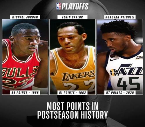 如果看高分的話更加瘋狂,米切爾生涯一共在季后賽3次拿下50+,這一數字在NBA歷史排在第三位,僅次于喬丹8次、張伯倫4次除了2020年首輪對陣掘金G1的單場57分之外,另外兩場分別是: