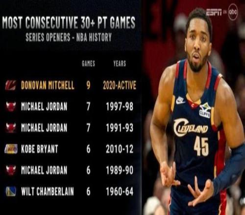但這場G1卻別有一番意義,在本場拿到32分之后,米切爾已經連續9個系列賽G1拿到30+了,這一數字排在歷史第一,紀錄具體排名如下: