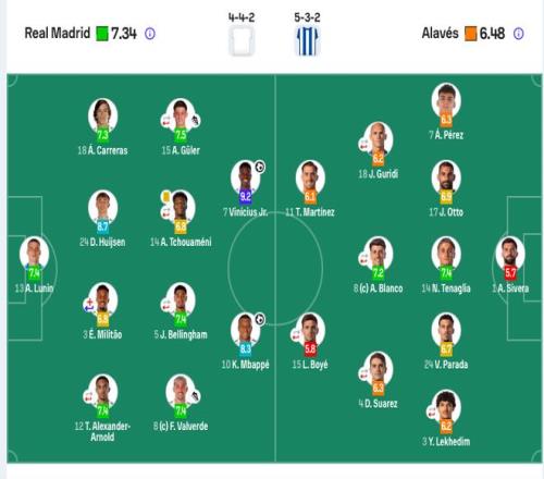 皇馬首發(fā):13-盧寧、12-阿諾德(63’2-卡瓦哈爾)、3-米利唐(45’22-呂迪格)、24-赫伊森、18-卡雷拉斯、8-巴爾韋德、5-貝林厄姆(58’30-馬斯坦托諾)、14-瓊阿梅尼(63’6-卡馬文加)、15-居萊爾(58’21-迪亞斯)、10-姆巴佩、7-維尼修斯。