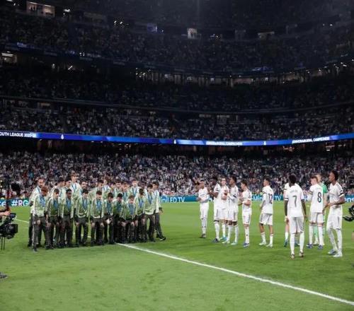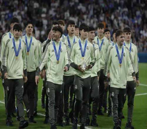 在北京時間今天凌晨進行的西甲第33輪皇馬主場迎戰阿拉維斯的比賽前,這支青年冠軍之師在伯納烏球場接受了球迷們的致敬,還在姆巴佩、維尼修斯、貝林厄姆等一線隊球星面前,展示了他們的冠軍獎杯,一線隊球員們為小伙子們進行了列隊歡迎。