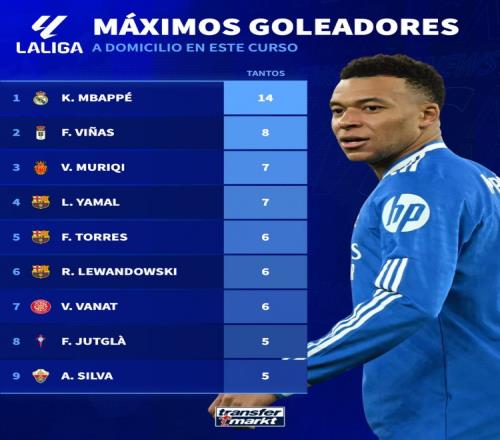 據德國轉會市場統計,姆巴佩本賽季西甲客場打進14球,西甲球員之中最多。