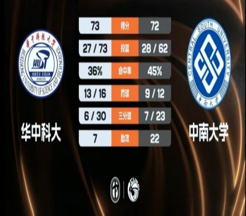 第四節,蔣玄燁三分引領7-0的攻擊波擴大領先,熊嘉俊連投帶罰拿分帶隊再度扳平,此后雙方爭奪陷入白熱化,關鍵時刻熊嘉俊造成殺傷兩罰中一,石豐銘絕殺失手。最終,華中科大73-72險勝中南大學。