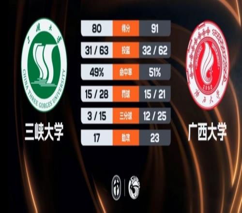 末節(jié)比賽,依哈帕力先中三分,席浩誠(chéng)里突外投連得5分,廣西大學(xué)穩(wěn)扎穩(wěn)打牢牢占據(jù)場(chǎng)上主動(dòng),三峽大學(xué)連投帶罰苦苦追趕,殷騰飛再中三分,無(wú)奈時(shí)間所剩無(wú)幾。最終,廣西大學(xué)91-80擊敗三峽大學(xué)。