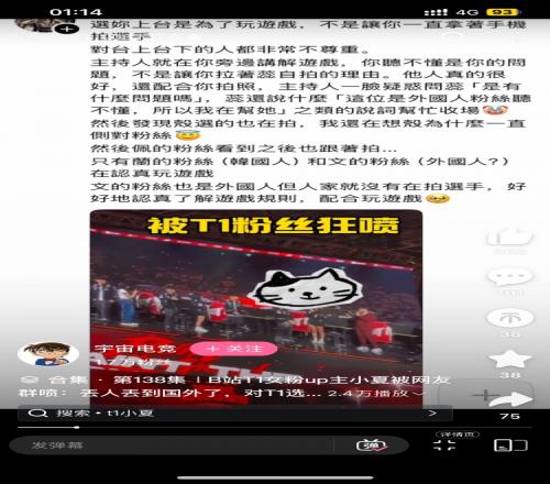 抖音博主“小夏”被現(xiàn)場抽中上臺和T1選手進(jìn)行互動游戲,但這一互動游戲的過程卻遭到外網(wǎng)T1粉絲的口誅筆伐,外網(wǎng)T1粉絲稱該博主在互動過程中全程舉著手機(jī)拍攝選手,并且完全不理會現(xiàn)場主持人的交流,而當(dāng)時的游戲環(huán)節(jié)也因?yàn)樵摬┲魍耆珶o法進(jìn)行。