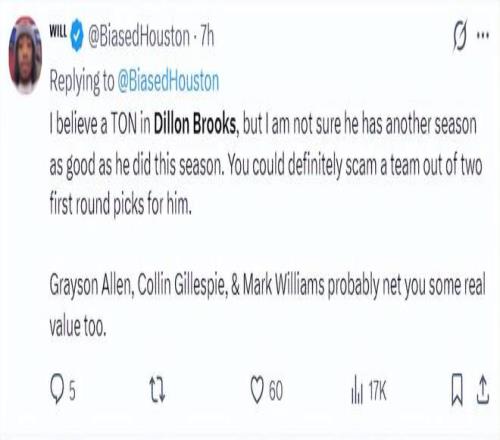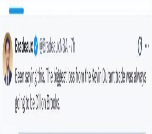 休媒Bradeaux也寫道:我一直這么認(rèn)為。從凱文-杜蘭特的交易中所造成的損失來看,最大的損失無疑就是狄龍-布魯克斯了。