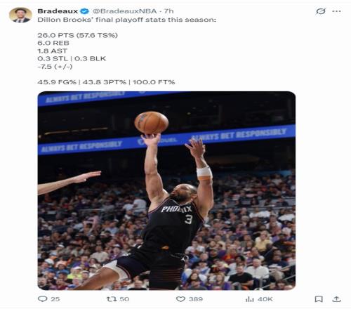 休媒Bradeaux曬出狄龍系列賽場均37.2分鐘,拿到26分6籃板1.8助攻0.25搶斷0.25蓋帽,命中率45.9%,三分命中率43.8%,真實(shí)命中率57.6%,罰球命中率100%的數(shù)據(jù)。(狄龍是太陽系列賽得分王,布克21.2分,格林21.8分)