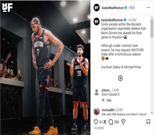 已經(jīng)有NBA記者開始討論杜蘭特休賽期申請交易或者火箭隊(duì)交易他的可能性。