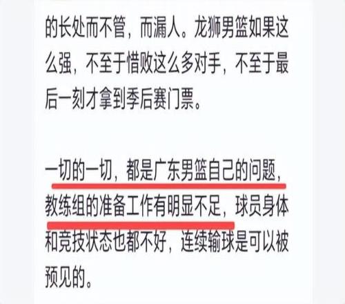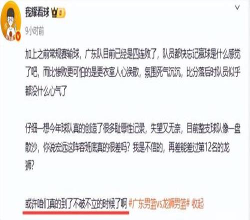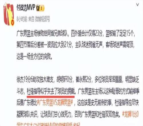 付政浩直言杜鋒失去了隊員信任,“多位球員渾渾噩噩,明顯缺乏斗志,杜鋒指導似乎失去了球員的擁戴”。廣東媒體人“我耀看球”怒批廣東隊人心渙散,“整支球隊像一盤散沙,你說宏遠這陣容班底真的很差嗎?我是不信的,再差能差過第12名的龍獅?”他不指名批評杜鋒:或許咱們真的到了不破不立的時候了啊。說得沒錯,廣東隊現場球迷一邊提前退場,一邊喊杜鋒下課。