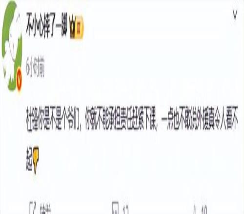 另一個媒體人“不小心摔了一腳”卻怒噴杜鋒不敢管控外援,任由他們胡扔三分浪費戰機,“杜鋒你是不是個爺們,你就不能承擔責任趕緊下課,一點也不敢說外援真令人看不起”。